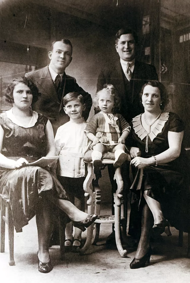 This is my mother’s sister and brother with their families. My mother’s sister, Sala, is sitting first from left. Her husband, Max Barasz, is standing above her. My mother’s brother, Pinek Schnitzer, is standing first from right, his wife, Klara, is sitting first from right. Sala and Max’s children, Lulu and Rennee, are sitting between the adults. The photo was taken in Paris in the 1930s.