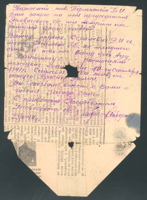 I have a note here, a piece of newspaper, which is a notification about the death of my daughter and my sister’s family. It is just a scrap of paper, but it states clearly that the Yanovichi borough council received a letter from me and sent a reply to it: ‘Your relatives, Raisa Sigalevich, her husband Sigalevich, their younger son, your daughter Ada and Ada’s grandmother, your husband’s mother, Chaya-Isya, were executed by the Fascists on 10th September 1941. Lev Sigalevich is alive, he is a Red Army officer.’ He is the only relative of my husband who survived. I keep this note. I received this letter, a reply to my inquiry, from the Yanovichi borough council chairman. The letter is written in legible handwriting. They even wrote: ‘We grieve about the death of your family.’ The letter was written on a piece of newspaper and sealed up in the form of a soldier’s triangle. Looks like they didn’t even have a clean piece of paper, because this happened right after the liberation of Yanovichi from the Germans.