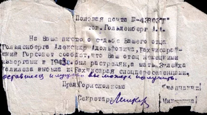 Referring to your letter stating death of your father Alexander Adolfovich Goldenberg, Bakhchisaray municipal council apprises you that your fathers was shot by German fiends in 1943, and mother Zeileikha Khalileva was evacuated from Bakhchisarai. You can receive the remaining chattels.