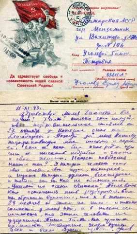 This is a letter my father Haim Ugolev wrote to my stepmother Galina Ugoleva. He wrote it from the front line in 1943 to Tatarstan, where our family stayed in evacuation during the war. He sent everyone in his family best wishes and asked to write him, the more the better. At that time my father was 40 years old. A year later he perished in action at the front of World War II, near the city of Novgorod. They wrote us that he had died ‘a hero's death.’ Later his company commander wrote us that my father had been the first to go over the top to launch an attack and had been shot.