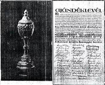 This is a letter of presentation published in Szentes in 1929 [5689]. The chalice seen in the photo was presented to the Szentes Israelite community on the occasion of the religious association's 120th anniversary of existence. You can read in the letter, that this is an artistically produced silver decorative cup, which the donors are presenting so that 'in the hand of the person chosen by the community at the traditional feast of the seventh of the month of Adar, he may proclaim the promise of fidelity, mercy, truth, love and peace.'