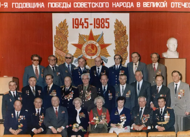 This picture was taken at the military registration office where we, war veterans, were invited to celebrate the 40th anniversary of the victory over Germany. I am standing on the right in the 3rd row, near Lenin's bust.