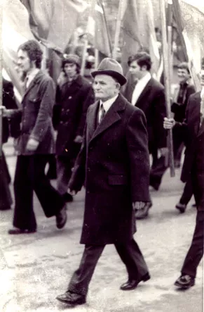 My husband Lev Gershenzon, photographed at the parade on 7 November 1973 with the students of his school. This photo was taken in Mogilyov-Podolskiy.