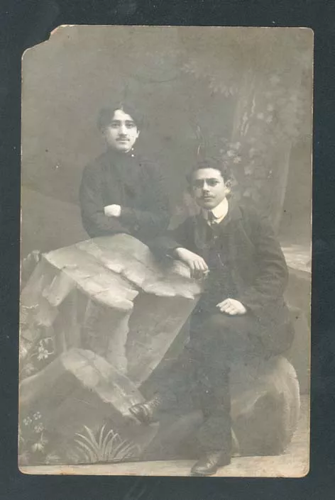 This is my elder brother Lev Perlstein, 20 years old, together with his friend (first from left) in St. Petersburg in 1910. Lev sent this picture to my parents.