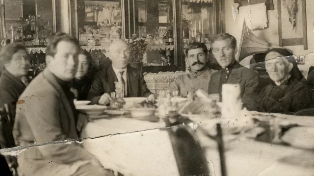 This is a dinner in the Goldberg house. The photo was taken in Nerchinsk in the 1910s. The woman in black is Shosya Goldberg, my great-grandmother, the mother of the Goldberg brothers.