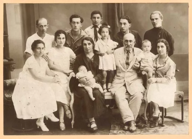 Here is the family of my father. In the first row at the left is his elder sister Rachel. She worked in the Crimean Komsomol, and was very active. Above her, in the second row, is her husband Gorev - he was a writer, and before the war they staged his play "On the banks of Neva" in Leningrad, in Alexandriysky theatre. He died in the middle of the 1970s, and my aunt died in 1936, of cancer. Next to her on this snapshot is her sister Fenya, I do not know, what her occupation was. Behind her is her husband Iosya. He worked at a defense factory, therefore they were evacuated to Sverdlovsk in 1941, and never came back to Leningrad any more. Next to her is my grandmother Frida, holding my cousin Galya, Fenya's daughter. The girl standing beside, is Inna, or Lenina, who you could see in the previous photo. Beside sits my grandfather, Berk Levit. Utmost right is father's sister Sonya with her son in her lap. And his name Rem is an abbreviation for "revolution, electrification, piece". Sonya, too, was an active Komsomol member, as well as her husband Nikandr (generally called Kolya), but his real name was Nikandr Kuzin - he is above her in the second row. Uncle Kolya at that time was the chief of construction of Pre-Baltic Electric Power Station, deputy of the Supreme Council of Estonia, they lived in Narva, and died in Pushkin, when they were retired. Behind grandfather is my father, then a student of the Leningrad Institute of Civil Engineers. Next to him on the left is his younger brother Abram. If you judge by his tie, he was a pioneer then. Later he became the leader of a Komsomol group. He worked as a deputy director of a large factory in Gatchina. Until 1941 all the family lived in Leningrad, and only after the war they were spread all over the country.