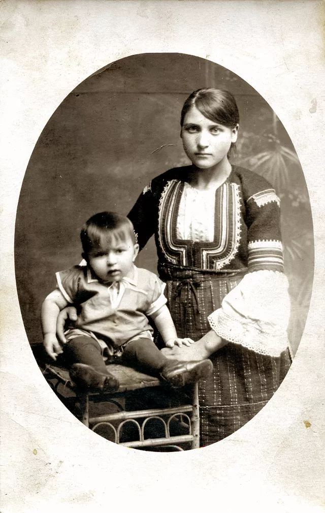 There were some girls coming from the nearby villages to take care of us when we were children. My parents had to hire these girls, because our house was really big. My father had a consulting office in the house, my grandfather's shop was downstairs and there was a lot of housework as well. These girls used to come and work for food and clothes. Many of them wore their traditional dresses, as you'll see on the pictures. When my brother was born, there was a maid, who was extremely clean and tiny. Her dress was always shining white as the snow. People were turning round to look at her on the street. Later she got married but she stayed close to my parents. Her daughter came to Dupnitza to study years after that and she stayed at my mother's. She kept on visiting them. She was like a member of our family.