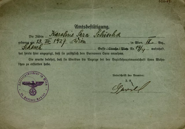 The card says: "The Jew Karoline Sara Schischa, born 13th March 1927 in 1090 Vienna, Scheuchgasse 19/4, thus states to take on the name Sara as a second first name. She was informed to hand in the information at the district authority office. of her place of residence."