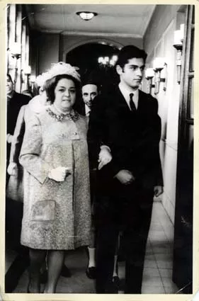 This is a photo of me and my son in the cortege of the wedding of my husband's sister Roza's daughter Fifi. I am going in with my son because my husband Isak is bringing in the bride. As the bride's father had died some time ago, my husband and I were given the honor of holding the tallet over the couple while they were being married in the synagogue. This is the hallway of the Neve-Salom synagogue, the hallway that leads to the big hall of ceremonies, where the wedding is to take place. My son was about 16 at that time and that day remains as a very nice memory in his mind.