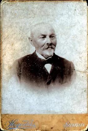 This is my paternal grandfather. The photo was taken in Szentes in 1918. My paternal grandfather was Lipot Gunst. I've seen the birth registration certificate and his name is registered as Leopold, but they called him Lipot in the shop, that's what was written on the sign: 'Lipot Gunst.' My grandfather was born in Szentes in 1844.