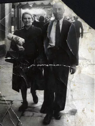 In this photo are my mother Liza and my father Yuda (Zhoudi) in a street in Plovdiv. They are going to the shops. There is no stamp of a photo shop on the back of the photo, nor any other inscription. The year was 1943.