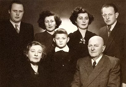 This family picture was taken in Vilnius in 1955. My parents Feiga and Isaac Abramson are sitting, my son Alexander Lukinskiy is between them, to the left standing my brother Abram Abramson with his wife Elder, I and my husband Vladimir Lukinskiy.