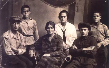 The Rozenfeld family. From left to right: my father's brothers Solomon Rozenfeld, Ruvim Rozenfeld, my grandmother Gitia Rozenfeld, my father's sister Anna Rozenfeld, my father Mikhail Rozenfeld, my father's brother Semyon Rozenfeld, Kiev, early 1930s.