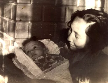 My father photographed my mother and me by our tiled stove. I am few months old. Signed on the backside: 'Luba Rozenfeld with her mother - Sophia Rozenstein'. Kiev, 1939.