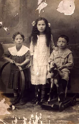 My mother Sophia Rozenstein - on the left, her older sister Dosia Rozenstein and younger brother Yuliy Rozenstein. Skvira, 1911. Signed on the backside: 'To dear parents on 14 August 1911. In the eternal memory Dosia, Sonia, Yeilik'.