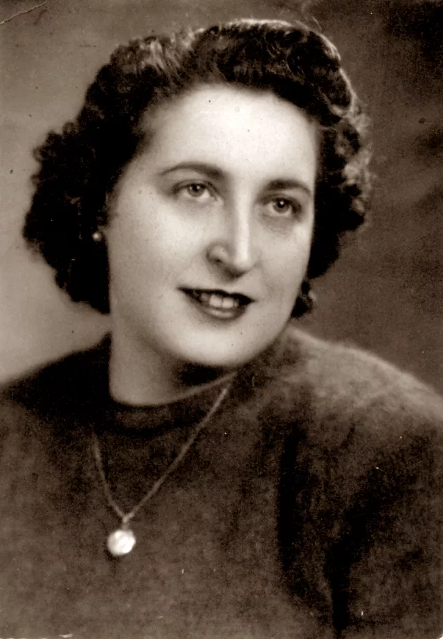 This here is my mother, Magdalena Springer, nee Iszakovics. The photo was taken in 1947 in Brasov, when she was 33 years old. She sent this picture to her sister, Klara Stern, nee Iszakovics, in Targu Mures, who had been deported to Auschwitz, but returned from there.