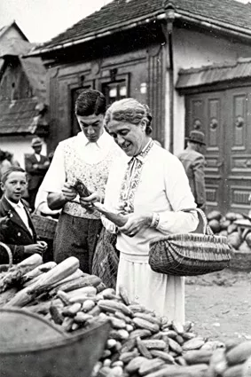 This photo was taken in the 1930s, and shows my mother’s sister Malvin Kürti (nee Duschnitz) with her son Karol at the market in Ruzomberok.