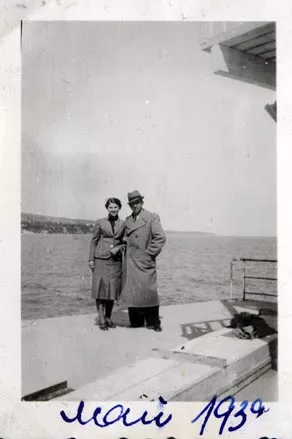 The picture was taken in May 1939 in Zlatni Pyasutsi resort near Varna [a town on the Black Sea coast] at a voyage de plaisir – honeymoon with my husband Sharlo [Shemuel Kohen]. The sea seemed to me very frightening and endless. We traveled by train. We visited some other towns like Vratsa, Belogradchik and we traveled on the Danube by ship. There is neither a stamp on the back of the photo, nor any other inscription.