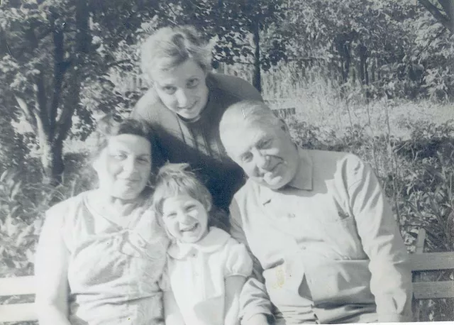 This photo was taken by my son-in-law Vladimir Raikhelson in the summer of 1974, at our country house in Strelna. Sittting on the bench are: myself, my granddaughter Nadezhda Lipovskaya, my first husband Serafim Lipovsky. Standing is my daughter Margarita Lipovskaya.