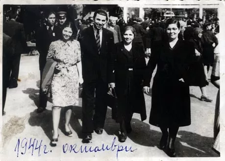 I, my brother Bouko, my mother Bouka and my sister Matilda. She was a beauty, a heavily built woman. I’m nothing compared to her. And that’s why mum married her quickly when she was 17 years old so that she wouldn’t marry a Bulgarian because she had a lot of suitors. The photo was taken in a street in Plovdiv. The year was 1944. There is neither a stamp on the back of the photo, nor any other inscription.