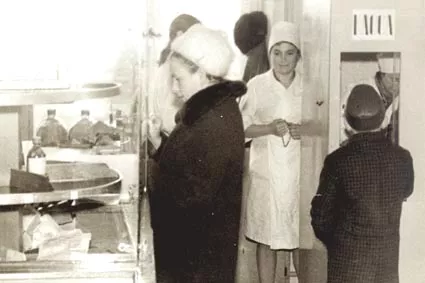 It shows my sister, Margotte Supyan, in the drug-store, where she worked as a pharmacist.