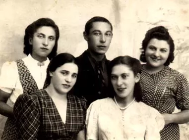 This picture was taken in Soroca in 1946. All my cousins Menihes, called after Grandmother Menihe, are in this picture. I am standing on the right in the motley dress. Uncle Motle’s daughter is standing on the left, Tuba's daughter, in the checkered dress, is sitting on the left, and Aron's daughter is on the right. My cousin Mikhail, Aron’s son, is standing in the center.