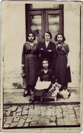 This is the undersigned, Marim Haller, the one on the right, my cousin, Liza Schwartz - the daughter of Dora Solomovici, my mother's sister -, the one on the left, Mrs. Seindl Margulies is the one in the middle, and the one in front is Aniela Margulies - Margulies' daughter - with her puppy. The photograph was taken in front of the Margulies's house. It could be during the early 1930's. It was I who recommended my cousin to be hired at Margulies, and she worked as a cashier there afterwards.