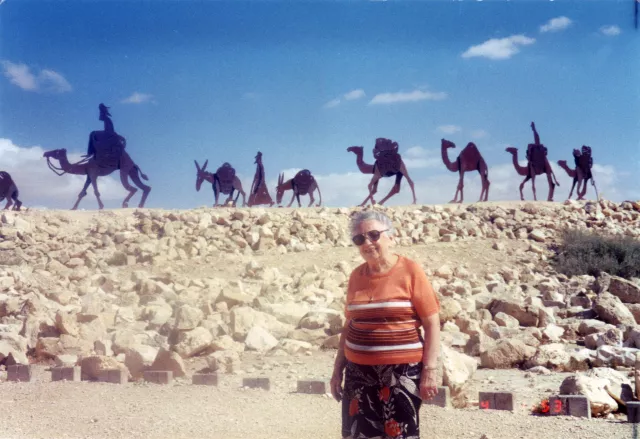 This is I, Marim Haller, in Israel. The camels that you can see in the back were not real, it was a mere frame in the open air and I had my photograph taken there. I still have that blouse to this day. I've been to Israel around 3 times. I don't remember in what years exactly, but the date on the back of this photograph reads 13th December 1997.
