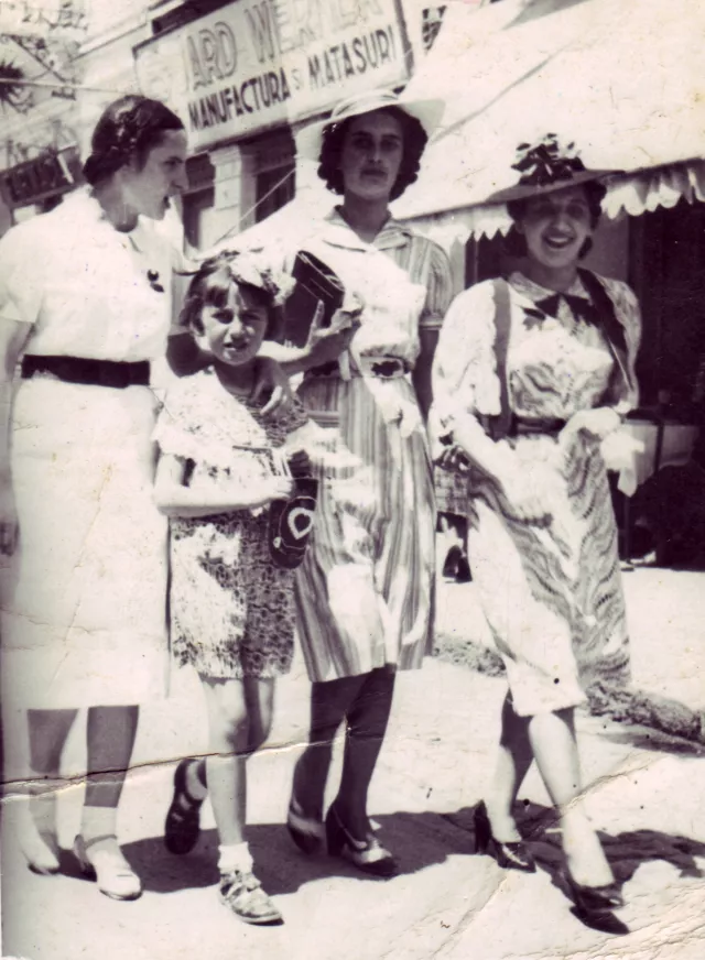 This is I, Marim Haller, the one on the right, with Anuta Dermer on my left and with her sisters. The date on the back of the photograph reads 8th June 1939; the photograph was taken here, in Botosani, somewhere in the old city center. I still have this hat to this day.