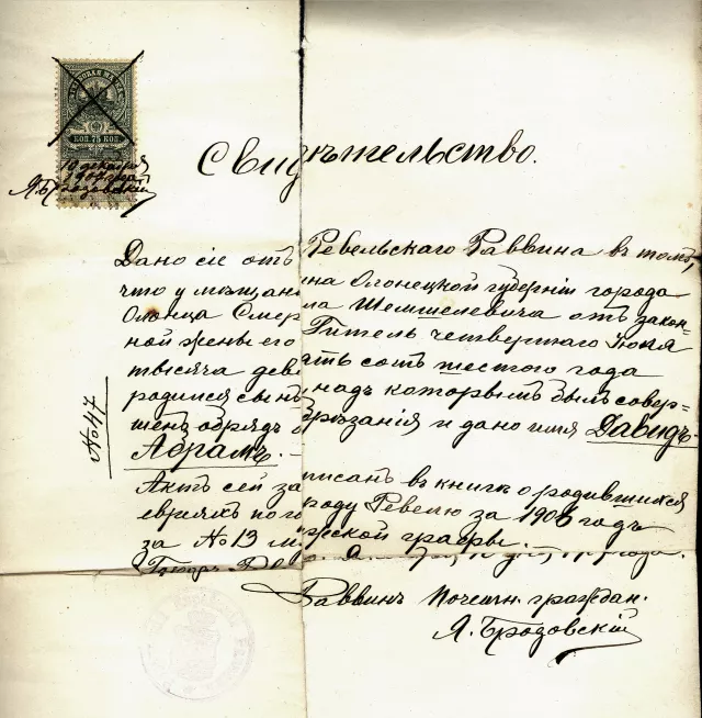 This photograph shows the birth-certificate of my uncle David (my mother’s brother). It was issued by rabbi in Revel in 1906.