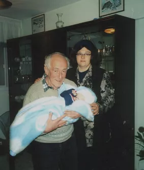 I am holding my newly-born great-granddaughter Maria Kogan. My granddaughter Sofia Kogan is standing behind me. The picture was made in Haifa in 2003 when I was visiting my son and grandchildren.