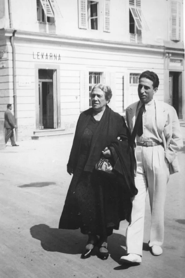 This is my grandmother Masaltov Zadok and her son Viktor Zadok, so basically my mother's mother and her brother. I think they are in Serbia, in Rogaska Slatina, where they went for a holiday. The picture was taken in 1934 because behind it, it says 18.VIII.1934. My grandparents went almost every year, sometimes my uncle and his family went, too; my family never went. My grandmother is wearing black not because she is in mourning but because she wore it a lot. My grandparents, my uncle’s family and my parents all dressed in a more European than traditional way.