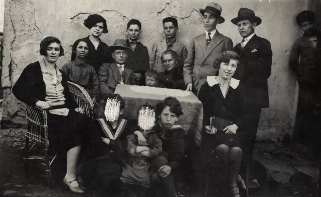 This is my first picture ever, taken in Sofia in 1930. I’m two years old here. My parents are standing around me. On the right one can see my three brothers standing. My two sisters Jina (right) and Vinka [Venezia] (left) who emigrated to Israel, where they live today, crossed themselves out here, because they didn't like how they came out in the picture. My elder sister Sara is to the left of my three brothers. The first from the right is a nephew of my father, Benzion, our houses had a shared yard, but I can't recall anything more about him. The sitting woman (the second from the right) is Aunt Lucha, our father's sister. Our cousin Mati is sitting with a purse in her hands below Benzion, she’s a daughter of my father's sister. She immigrated to Israel in the 1930s, but I know very few things about her life. She and her relatives think of themselves as sabras, ‘local citizens.’