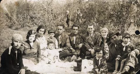 This is a picture of my parents Mandil and Solchi Levi and me, and also some of their friends. The picture was taken in the suburbs of Karnobat in the 1930s.