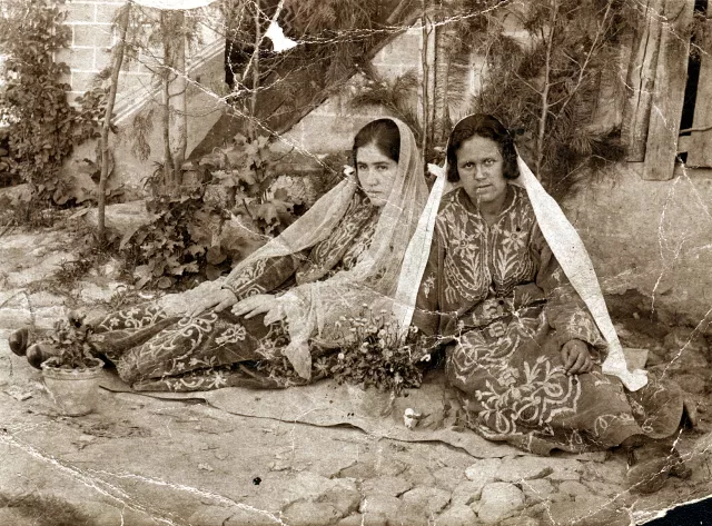 This is a picture from the 1920s of my mother's sister Matilda Nisim Miuhas and Matilda Buko Lazar, the wife of my mother's brother Buko Lazar, in Kiustendil. They are wearing Jewish dresses made of purple velvet and silk embroidery, draped with a scarf.