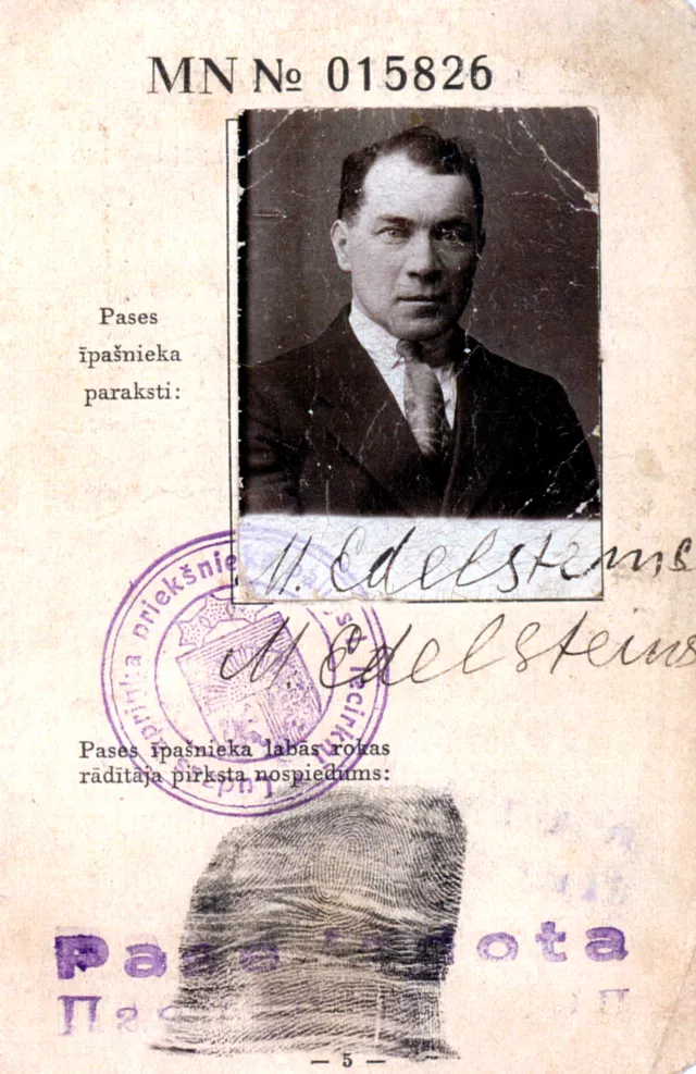 This is the first page of the Latvian passport of my father Meishe Edelstein with his photograph. When in 1940 Latvian passports were replaced with the Soviet ones, my father retrieved this page from his passport and kept it for the memory. This photo of the early 1930s was taken in Riga.