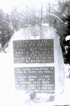 In 1993 we went to say good-bye to the family of my sister, who were going to emigrate to the USA altogether. Certainly we went to the old Jewish cemetery to give the last glance at the native graves. At the cemetery there is a tombstone with the following inscription 'In commemoration of all gentiles, who saved 55 Jews at the risk of their life.' This inscription is made in Hebrew and in Lettish. We also visited that place, where the synagogue was situated: that very synagogue, which we visited together with our parents during our childhood. The synagogue was burnt down during the time of occupation. People built some sort of memorial from its ruins.