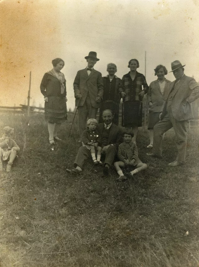 This family photo was taken during a vacation in Vijeanca, a resort not far from Czernowitz, Bukovina. We stayed in the house of a relative of my maternal grandmother Malca Engler's. We paid for the room and stayed one month. In the back row, the first from the right, the gentleman wearing a hat, is my uncle Mendel Sandman with Aunt Tiny, his wife, next to him; the lady in the checkered jacket standing next to them is my mother, Antonia Margulies. Grandmother Malca Engler, Grandfather Berl Engler's second wife, is in the middle; to the left, next to her, is a relative of hers from Vijeanca whose name I don't know. Behind, on the left, the lady with the white muffler around her neck is Saly Engler, the wife of Zuzu Engler, my mother's step-brother. Below, in the middle, is my father, Arthur Margulies, holding my brother, Hary, in his arms. I'm the one next to them. This amateur photo was probably taken in 1927 or 1928, when our relatives came to visit us in Vijeanca.