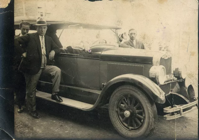 This is my uncle Mendel Sandman next to his German car; I don't know what brand it was, but I know he was the first to own a car in Czernowitz. So the picture was taken in the 1930s. Sandman is the one with a hat. The blonde boy on the other side is his chauffeur - I only know his name was Karl. I don't know who the third person, the one behind Sandman, is.