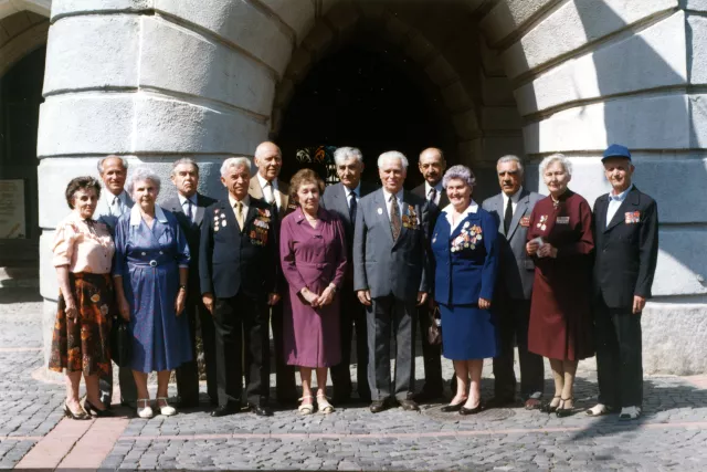 This photo was taken in 2004, in Mukachevo, in the Veterans' Club, in front of the town council. I'm more or less in the middle of the first row. At that time I was the chairman of the Veterans' Club.