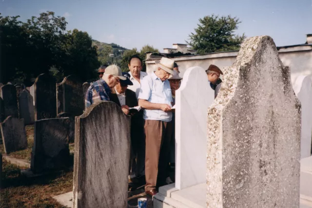This photo was probably taken in the year 2000 in Mukachevo in the Jewish cemetery, at the grave of rabbi Shapira. Every year the Rovt family comes to visit Mukachevo. They live in America, and each year they come to visit the grave of rabbi Shapira. The man in the hat on top of rabbi Shapira's grave is old Mr. Rovt. I'm the man wearing the brown cap on the left.
