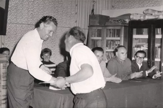 This photograph was taken in 1960, when I was the director of a factory and those are bricklayers. I'm the one on the left. I was director and was presenting some award. The photo was taken in Mukachevo in the construction company club. We met in the club once a month. The main themes of our meetings were various tasks and responsibilities.