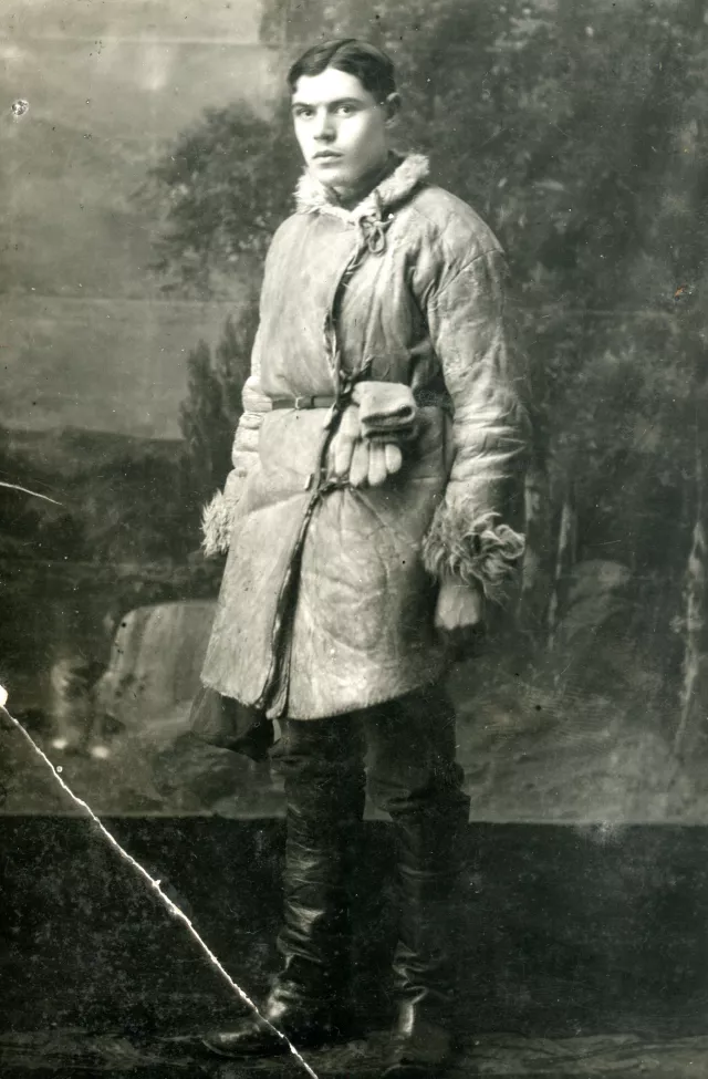 This is my uncle, my mother's brother, Akim Ulman at the age of 24. The picture was taken in the winter of 1919 in Petrograd. He worked as an economist at that time. He is wearing a leather sailor's jacket and boots; warm knitted mittens are stuck behind the belt.