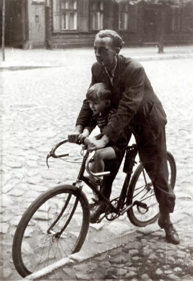 This is the photo of my friend Stefan Klajn with my son Aleksander. Stefan is still alive. He lives in Israel. He went there in 1952 after persecutions. The photo was taken in 1952 on some street in Lodz. I don’t remember the name of the street. I also don’t rememebr the name of the photographer who took this photo.