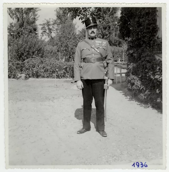 This is my father, Miksa Domonkos, in his captain's uniform in the garden of our summer cottage in Rakoscsaba in 1936. My brother took the picture.