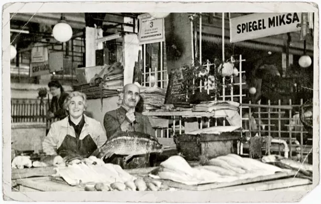 You can see Uncle Miksa Spiegel and his wife in the picture. They were fishmongers at the Hold Street market hall, I remember that they wore rubber aprons, and they were the parents of one of my cousins. My mother usually bought fish from them.