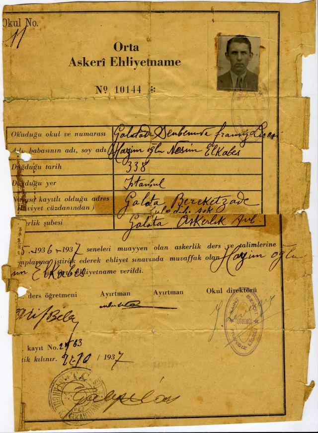 I, Nesim Alkabes, was born on July 21st, 1920 in our brick home that was 30 m. further from Galata Kulesi [A neighborhood on the European side where Jews congregated in the beginning of the 20th century] with the help of a midwife. All my other siblings were born in this house like me. My father bought this house with his savings. We lived on one flat and rented out the other 3 flats. We lived there between 1920-1928. As far as I remember, it was not a big house. The entrance opened up to a hallway, at the end of it was the bedroom of my maternal grandmother, but it was such a small room that she did not have a bed, she would make one for herself every night on the floor. We had a closet we called "Yükli" in this room. We would put items such as mattresses, comforters in there. The system of sleeping on a floorbed worked for all of us, we all slept on the floor. We warmed the house with a coke-burning stove as well as a Belgian stove called "Salamandra" where you would feed it coals from the top and remove the ashes from the bottom. The maid lit these stoves. In the bathroom of this house, there was a shower boat, we didn't have a tub, once a month, in accordance with the rules of kashrut, we would go to a hamam in Kasimpsha together with all the ladies of the house (because I was still young). We would go there with a horse-carriage, this was a big event for us (paseo). The men would go to "Galatasaray Hamami" every Friday.