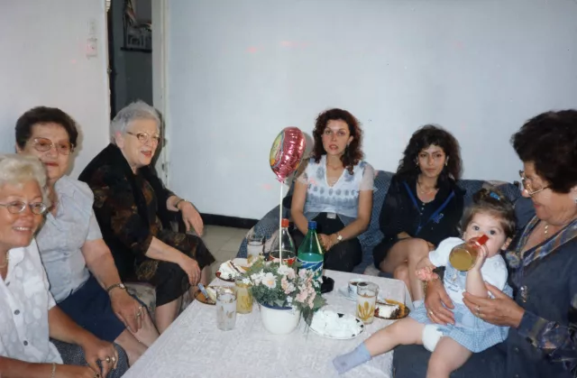 These are my three sisters with my daughter Tinka and my granddaughter Maya shortly after she was born, that is in 1997. Maya is Rossitsa's child and Rossitsa is on her turn Tinka's daughter. From left to right one can see Tinka (with the blond hair), behind me is Sara, with the white hair (1920-2001). Next to her is my granddaughter Rossi, then Tanya and from the utmost right is my sister Ester.