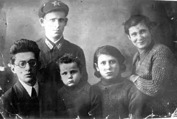 Sitting from left to right: my husband Wolf Ratiner, my sister Rulia's older son Naum and I, Mina Smolianskaya. Standing: my brother Joseph and my sister Donia. Photo made in Odessa in 1939 when Donia was visiting Odessa.