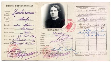 This is my mother’s identity card, issued by the Population Bureau, Kingdom of Romania - Population Bureau Iasi on 12th July 1937. Here’s what it reads: Family name Zuckerman, first name Minta, nickname, nee Moise, profession housewife, place of birth Iasi , birth date 6th October 1889, domicile in Sarariei Street no. 191, registered on 16th May 1921, age 48 years, middle height, brown hair. Signed Minta Zuckerman. Deceased on 30th April 1939.